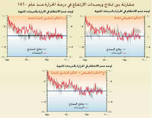 | وعلى الصعيد العالمي، من المرجح جدا أن التسعينات كانت أشد العقود احترارا وأن عام 1998 كان أشد الأعوام احترارا في فترة التسجيل باستخدام الأجهزة (1861-2000) (أنظر الإطار 1 في الملخص لصانعي السياسات). ومن المرجح أن الارتفاع في درجة الحرارة السطحية خلال القرن العشرين في نصف الكرة الأرضية الشمالي كان أعلى من الارتفاع في درجة الحرارة السطحية في أي قرن آخر خـلال الألف سنة الماضية (أنظر الجدول1 من الملخص لصانعي السياسات). ولا تتاح معلومات كافية قبل عام 1860 في نصف الكرة الجنوبي لمقارنة الاحترار الذي حدث مؤخرا مع التغيرات خلال الألف سنة الماضية. ولم تكن التغيرات في درجة الحرارة متسقة عالميا ولكنها تفاوتت بتفاوت المناطق وفي مختلف الأجزاء السفلى من الغلاف الجوي. | |||||||||||||||||||||||||||||||||||||||||||||||||||||||||||||||||||||||