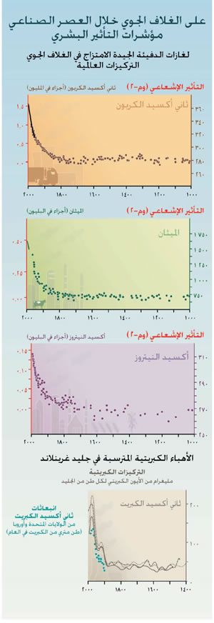 2-1: سجلات التغيرات السابقة في تركيب الغلاف الجوي خلال الألفية الماضية تظهر