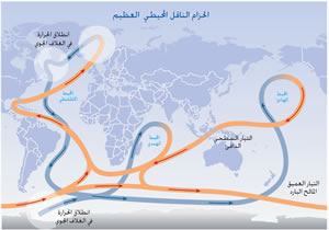 توضيح تخطيطي لنظام الدوران العالمي في محيطات العالم، وهو يتألف من الطرق