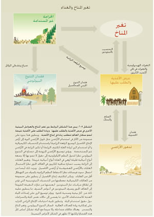 هذا الشكل الروابط بين تغير المناخ والعوامل البيئية الأخرى في عرض الأغذية
