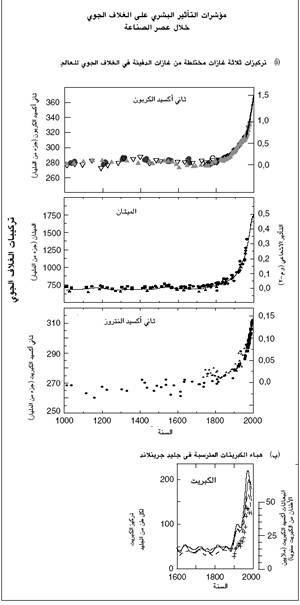 ![]() الشكل 2 السجلات الطويلة للتغييرات في الماضي في تركيب الغلاف الجوي توفر السياق لتأثيرات الانبعاثات نتيجة للأنشطة البشرية. (أ) يبين التغيرات فى تركيزات ثاني اكسيد الكربون في الغلاف الجوي(CO2) والميثان (CH4) وثاني أكسيد النتروز (N2O) خلال الألف عام الماضية. وتستكمل البيانات الخاصة بعينة الجليد الأسطوانية في العديد من المواقع في المنطقة القطبية الشمالية وجرينلاند (المبينة برموز مختلفة) ببيانات من عينات مباشرة من الغلاف الجوي خلال العقود الماضية (مبينة بحسب الخط الخاص بثاني أكسيد الكربون ومدرجة في المنحنى الذي يمثل متوسط الميثان في العالم). وقد حدد التأثير الإشعاعي الموجب التقديري للنظام المناخي على المقياس الوارد ناحية اليمين. ونظرا لأن لهذه الغازات عمرا يبلغ عقدا أو نحو ذلك في الغلاف الجوي، فهي مختلطة بصورة جيدة وتعكس تركيزاتها الانبعاثات من مصادر مختلفة في أنحاء العالم. وتبين السجلات الثلاثة تأثيرات النمو الكبير والمتزايد في الانبعاثات الناجمة عن الأنشطة البشرية في العصر الصناعي. (ب) تبين تأثيرات الانبعاثات الصناعية على تركيزات الكبريتات التي تنتج تأثيرات إشعاعية سالبة. كما يظهر السجل الزمني لتركيزات الكبريت لا في الغلاف الجوي، بل في العينات الجليدية الاسطوانية في جرينلاند (المبينة في خطوط أزيلت منها التأثيرات العرضية للثورات البركانية). وتبين هذه البيانات الترسيب المحلي لهباء الكبريت في الموقع مما يعكس انبعاثات ثاني أكسيد الكبريت في الارتفاعات المتوسطة في نصف الكرة الأرضية الشمالي. ويبين هذا السجل، رغم أنه ذو طابع إقليمي أكتر من غازات الدفيئة المختلطة عالميا، النمو الكبير في انبعاثات ثاني أكسيد الكبريت الناجم عن الأنشطة البشرية خلال العصر الصناعي. وتشير الزيادات إلى انبعاثات ثاني أكسيد الكبريت التقديرية الإقليمية ذات الصلة (المقياس على الجانب الأيمن). [استنادا إلى (أ) الفصل الثالث, الشكل 3-2 (ب) (ثاني أكسيد الكربون) الفصل الرابع الشكل 4-1, (أ) و(ب) (الميثان) ( CH4) و الفصل 4, الشكل 4- 2 (ثاني أكسيد النتروز (ب) الفصل الخامس, الشكل5-4 أ] |