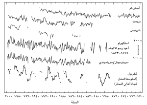 ![]() الشكل 6: السلاسل الزمنية للمستوى النسبي لسطح البحر خلال الثلاثمائة عام الماضية من أوروبا الشمالية: أمستردام، هولندا، بريست، فرنسا، شيرنيس، المملكة المتحدة، استكهولم، السويد (أعيد رسم الاتجاه خلال الفترة 774 1 إلى 1873 لإزالة أولا مساهمة الفترة بعد الجليدية) وسوينجي، بولندا (وسوينموندي في السابق، ألمانيا) وليفربول المملكة المتحدة. فالبيانات المتعلقة بالأجهزة هي للمتوسط المعدل لمياه أعالي البحار وليس لمتوسط مستوى سطح البحر، وتشمل فترة عقدية (18.6 عام). ويبين عمود القياس 100 مم [استنادا إلى الشكل 11-17] |