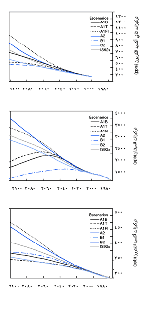 تتباين الحسابات النموذجية لتركيزات غازات الدفيئة الرئيسية غير ثاني أكسيد الكربون تباينا كبيرا في عام 2100 عبر السيناريوهات التوضيحية الستة الواردة في التقرير الخاص SRES. وعموما فإن السيناريوهات A1B, A1T و B1 تنطوؤ على أقل الزيادات, و A1FI و A2, أعلاها.وتتراوح التغييرات في الميثان من 1998 إلى 2100 بين 1900و +1970جزء في المليون (- 11 إلى+ 112%) وزيادة ثاني أكسيد الكربون من +83 إلى +244 جزء في البليون (+12 إلى +46%) (انظر الشكل 17 ب و ج). وتصل تركيزات الهيدروفلورو كربونات (134أ و 143أ و 125) إلى بضعة مئات الألوف من جزء في الطن من المستويات التي لا تذكر اليوم. ويتوقع أن يزيد كلوروفيل الكربون والبرفلورو ميث ان بما يتراوح بين 200 و400 جزء في الطن, و SF6 بنحو 35 إلى 65 جزء في الطن.