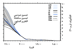 ![]() الشكل 19: نتائج النموذج البسيط: تقديرات التأثيرات الإشعاعية التاريخية بشرية المنشأ حتى عام 2000 تليها التأثيرات الإشعاعية للسيناريوهات الست التوضيحية في التقرير الخاص. وتبين الظلال مجموعة التأثيرات التي تشمل كامل السيناريوهات الخامسة والثلاثين الوا. وتبين طريقة الحساب عن نسب تلك المشروحة في الفصول. وتعتمد القيم على التأثيرات الإشعاعية لمضاعفة ثانيأكسيد الكربون من سبعة نماذج للدوران العام للغلاف الجوي وا تأثيرات لمحيطات كما ترد IS92a, IS92c, IS92e باتباع نفس طريقة الحساب. [استنادا إلى الشكل 9-13] |