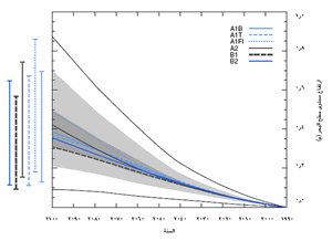 ![]() الشكل 24: المتوسط العالمي لارتفاع مستوى سطح البحر خلال الفترة 1990- 2100 في سيناريوهات التقرير الخاص SRES حسبت التغيرات في الزيادة الحرارية والجليد الأرضي باستخدام نموذج مناخ بسيط جرى تصميمه بصورة منفصلة لكل نموذج من النماذج السبعة الخاصة بالدوران العام في الغلاف الجوي والمحيطات، وأضيفت مساهمات من التغيرات في الجليد الدائم وتأثيرات الترسبات الدائمة والتعديلات طويلة الأجل في الصفائح الجليدية مع التغير المناخي السابق. وكل خط من الخطوط الستة الظاهر في المناخ يمثل متوسط نماذج الدوران العام في سيناريو من السيناريوهات التوضيحية الستة. وتبين منطقة الظلال الداكنة مدى متوسط نماذج الدوران العام في جميع السيناريوهات الخمسة والثلاثين الواردة في التقرير الخاص SRأما المنطقة المظللة بصورة أفتح فتبين مدى جميع نماذج الدوران العام في جميع السيناريوهات الخمسة والثلاثين. أما المنطقة المحددة بالخطوط الخارجية فتبين مدى جميع نماذج الدوران العام والسيناريوهات بما في ذلك عدم اليقين المحيط بالتغيرات في الجليد الأرضي، وال تغيرات في الأراضي دائمة التجمد والترسبات الدائمة. ويلاحظ أن هذا المدى لا يراعي عدم اليقين المرتبط بالتغيرات في دينامية الجليد في الصحيفة الجليدية في غرب المنطقة القطبية الشمالية. [استنادا إلى الشكل 11-12] |