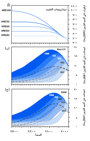 تتطلب جميع ملامح التثبيت التي تمت دراستها خفض انبعاثات ثاني أكسيد الكربون في نهاية المطاف إلى ما دون المستويات الحالية. رفعت من الملخصات الموصوفة لثاني أكسيد الكربون معدلات انبعاثات هذا الغاز البشري المنشأ التي وصلت عند مستويات تركيز ثاني أكسيد الكربون الثابتة والتي تتراوح بين 450 و 1000 جزء في المليون (الشكل 25 أ). ولا تختلف النتائج (الشكل 25 ب) اختلافا كبيرا عن تلك الواردة في تقرير التقييم الثاني، وان كان المدى أوسع وذلك أساسا نتيجة لمدى امتصاص الكربون الأرضي في المستقبل بسبب الافتراضات المختلفة الواردة في النماذج. وسوف يتطلب التثبيت عند 450 أو 650 أو 1000 خفض الانبعاثات بشرية المنشأ إلى ما دون مستويات 1990 في غضون عقدين، ونحو قرن أو نحو قرنين على التوالي، وتستمر في الانخفاض باطراد بعد ذلك. وعلى الرغم من أن هناك قدرة كافية على الامتصاص في المحيط لاستيعاب 70 إلى 80% من انبعاثات ثاني أكسيد الكربون بشرية المنشأ المتوقعة، فإن هذه العملية تستغرق قرونا بالنظر إلى معدل اختلاط مياه البحر. ولذا، فإنه حتى بعد عدة قرون من حدوث الانبعاثات، سيشكل نحو ربع الزيادة في التركيزات الناجمة عن هذه الانبعاثات مستقرا في الغلاف الجوي. ويتطلب المحافظة على تركيز ثابت لمستوى ثاني أكسيد الكربون بعد عام 2300 انخفاض الانبعاثات لتواكب معدل امتصاص الكربون في ذلك الوقت. غير أن نقاط الامتصاص في الأراضي الطبيعية والمحيطات التي تتمتع بالقدرة على الاستمرار لمئات أو آلاف السنين تعتبر صغيرة (أقل من 0,3 PgC في السنة).