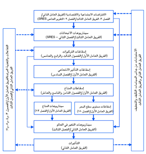 ويتطلع هذا القسم إلى المستقبل بطريقة مختلفة. فعدم اليقين يسود كل خطوة من خطوات السلسلة ابتداء من انبعاثات غازات وهباء الدفيئة حيث التأثيرات التي تمارسها على النظام المناخي والمجمل (انظر الشكل 28).وهناك العديد من العوامل التي مازالت تحد من القدرة على رصد وعزو وفهم تغير المناخ في الوقت الحالي، ووضع إسقاطات لما قد تكون عليه التغييرات المناخية في المستقبل. ومازال الأمر يحتاج إلى مزيد من العمل في تسعة مجالات عامة.