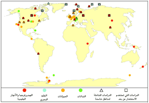 عدد الأنواع الأحيائية والعمليات في كل منطقة التي تبين في كل دراسة أنها