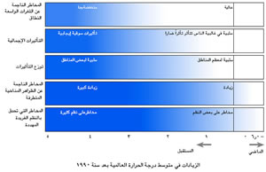 ويعرض الشكل 12 في الملخص الفني استنتاجات نوعية بشأن تأثيرات تغير المناخ المتصلة بالأسباب التي تدعو للقلق. وعند حدوث زيادة صغيرة في متوسط درجة الحرارة (3) على الصعيد العالمي وبعض الأسباب الداعية للقلق تظهر إمكانية حدوث تأثيرات سلبية، في حين تظهر أسباب أخرى تأثيرات ضارة أو أخطار قليلة. وعند حدوث زيادات في درجة الحرارة تبين جميع الدلائل إمكان حدوث تأثيرات ضارة حيث تصبح التأثيرات في كل سبب من الأسباب الداعية للقلق أكثر سلبية عند تزايد درجات الحرارة. وتوجد ثقة عالية في هذه العلاقة العامة بين التأثيرات وتغير درجة الحرارة، بيد أن الثقة تعتبر عموماً منخفضة في التقديرات الخاصة في حدود بداية تغير درجات الحرارة التي تحدث عندها مختلف أنواع التأثيرات. [الفقرة 19-8]