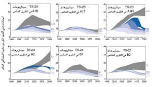 الشكل 2: مقارنة بين السيناريوهات المرجعية وتلك الخاصة بالتثبيت. ينقسم الشكل إلى ستة أجزاء. جزء لكل مجموعة سيناريوهات مرجعية من التقرير الخاص لسيناريوهات الانبعاثات (SRES). ويبين كل جزء من الشكل نطاق مجموع انبعاثات ثاني أكسيد الكربون في العالم (جيجا طن من الكربون) من جميع المصادر البشرية المنشأ بالنسبة لمجموعة السيناريوهات المرجعية الواردة في التقرير الخاصة (مظللة باللون الرمادي) ونطاقات مختلف سيناريوهات التخفيف التي جرى تقييمها في تقرير التقييم الثالث مما يؤدي إلى تثبيت تركيزات ثاني أكسيد الكربون عن مستويات مختلفة (مظللة بالألوان). وتقدم السيناريوهات في الزمرة A1 مقسمة إلى ثلاث مجموعات (المجموعة A1B المتوازنة والشكل A2-TS) والخالية من الوقود الأحفوري (الشكل TS-2B ) والكثيفة الوقود الأحفوري A1F1 (الشكل TS-2C) وتثبيت تركيزات ثاني أكسيد الكربون عند 450 و 550 و 650 و 750جزءا من المليون من حيث الحجم في الشكل TS-2e. والمجموعة B2 التي تشمل التثبيت عند 450 و 550 و 650 جزءا من المليون من حيث الحجم في الشكل TS-2e. ولا تتوافر دراسات لتقدير سيناريوهات التثبيت عند 1000 جزء في المليون من حيث الحجم. ويوضح الشكل أنه كلما انخفض مستوى التثبيت، زادت انبعاثات خط الأساس واتسعت الفجوة. ويمكن أن يكون الفرق بين الانبعاثات في مجموعات السيناريوهات المختلفة بنفس سعة الفجوة بين السيناريوهات المرجعية وتلك الخاصة بالتثبيت داخل المجموعة الواحدة. وتبين الخطوط التي تتداخل فيها النطاقات (أنظر الإطار TS.1). |