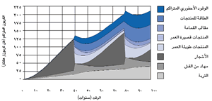 الشكل 6: توازن الكربون من مشروع افتراضي لإدارة الغابات ملاحظة: يبين الشكل التغيرات في المخزون التراكمي من الكربون- المخزون في سيناريو يشمل التشجير وحصاد مزيج من المنتجات الحرجية التقليدية مع استخدام بعض هذا الحصاد في شكل وقود. وتشير القيم إلى ما قد يمكن ملاحظته في جنوب شرق الولايات المتحدة أو وسط أوروبا. فإعادة النمو يعيد الكربون من جديد إلى الغابة، ويجري حصاد الغابة (الافتراضية)، كل 40 عاما مع ترك بعض المهاد من القش على الأرض لتتحلل، ويجري تجميع المنتجات أو التخلص منها في مقالب القمامة. وتوجد تغييرات صافية من حيث، مثلا، أن الشكل يبين وفورات في انبعاثات الوقود الأحفوري بالمقارنة لسيناريو بديل يستخدم الوقود الأحفوري وبدائله، أي المزيد من المنتجات كثيفة الطاقة لتوفير نفس الخدمات. |