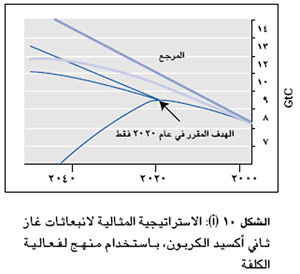 وتسعى تحليلات فعالية الكلفة إلى أقل التكاليف لتحقيق الأهداف البيئية، بتوزيع التكاليف الحدية للتخفيف على الزمان والمكان. فدراسات فعالية الكلفة طويلة الأجل تقدر تكاليف تثبيت تركيزات ثاني أكسيد الكربون في الغلاف الجوي على مستويات مختلفة، وتستخلص أن تكاليف الحد الأقصى عند 450 جزء من المليون من حيث الحجم أكبر بكثير من تكاليف الحد الأقصى عند 750 جزء من المليون من حيث الحجم. فبدلا من السعي إلى طريق أمثل واحد، فإن منهج النوافذ المحتملة/ الهبوط الآمن تسعى إلى تحديد مجموعة كاملة من الطرق المحتملة للانبعاث تتفق وتأثيرات المناخ المحددة خارجيا ومشكلات تكاليف الانبعاثات. وتشير النتائج إلى أن التأخير في التخفيض الفعال للانبعاثات في المدى القصير، قد يقلل بصورة خطيرة من مجموعة الخيارات في المستقبل لتحديد أهداف ضيقة نسبيا لتغير المناخ، في الوقت الذي تتيح فيه الأهداف الواسعة نسبيا فرصة أكبر للمرونة في الأجل القصير.
