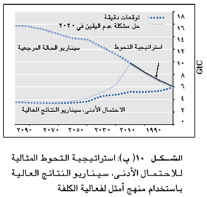 بين الشكل 10a نتائج تحليل فعالية الكلفة الذي يستكشف أفضل استراتيجية تحوطية عندما لا تحل مشكلة عدم اليقين بالنسبة لهدف الاستقرار في الأجل الطويل حتى عام 2020، بما يوحي بأن التخفيف خلال السنوات القليلة المقبلة سيكون له قيمته الاقتصادية إذا كان هناك احتمال ملموس بالبقاء دون الحد الذي لولا ذلك لوصلنا إليه خلال الفترات الزمنية المحددة للنظم التي تنتج غازات الدفيئة. هناك حساسية في درجة التحوط في الأجل القصير في التحليل السابق لتاريخ حل مشكلة عدم اليقين، والقصور الذاتي في نظام الطاقة، ولضرورة تحقيق الهدف النهائي للتركيزات (بمجرد إعلانه) بأي ثمن. وتبين التجارب الأخرى، كنماذج التكلفة والمنافع المتأطرة كمشكلة تحليل قرار Bayesian أن أفضل طرق للانبعاثات في الأجل القصير (العشرون عاما المقبلة) لا يحدث بها سوى تغيير طفيف إذا كان هناك بعد نظر واضح، مع التحوط حتى للاحتمالات الضعيفة، والسيناريوهات التي تحتوي على نتائج مؤثرة (انظر الشكل 10b). ومع ذلك، ربما يتعين اتخاذ القرارات المتعلقة بسياسات المناخ في الأجل القصير أثناء مناقشة أهداف التثبيت. ولذا فإن عملية اتخاذ القرار ينبغي أن تفكر في التحوط المناسب في مواجهة القرار المستقبلي لهذا الهدف واحتمال إعادة النظر في الأفكار العلمية الخاصة بمخاطر تغير المناخ. وهناك اختلافات ملموسة في هذين المنهجين. ففي تحليل فعالية الكلفة، ينبغي تحديد الهدف بغض النظر على التكاليف. أما في تحليل التكاليف والمنافع، فإن التكاليف والمنافع تتوازن على الهامش. ومع ذلك، فإن الرسالة الأساسية تكاد تكون واحدة، وتشمل الإدراج الواضح لعدم اليقين، وما يترتب على ذلك بمرور الوقت. أما القدر المناسب من التحوط، فيتوقف على تقدير الفرد للمخاطر والمفاجآت وتكاليف تدابير السياسات. أما علاوة الخطر- وهي المبلغ الذي يكون المجتمع على استعداد لدفعه لتقليل المخاطر- فهو في النهاية قرار سياسي ويختلف من بلد إلى آخر.
