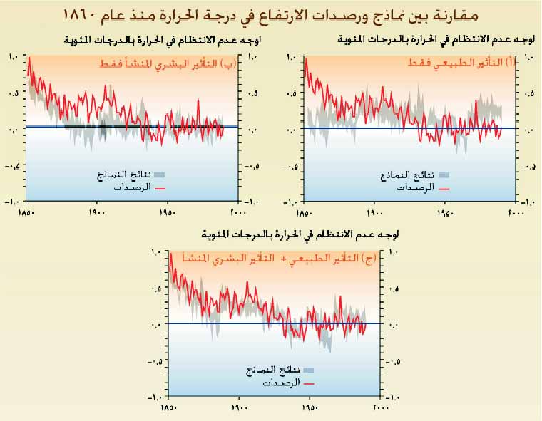 الماضي، ولكن أفضل توافق بين الرصدات يتحقق في (ج) عندما يتم إدراج العوامل الطبيعية