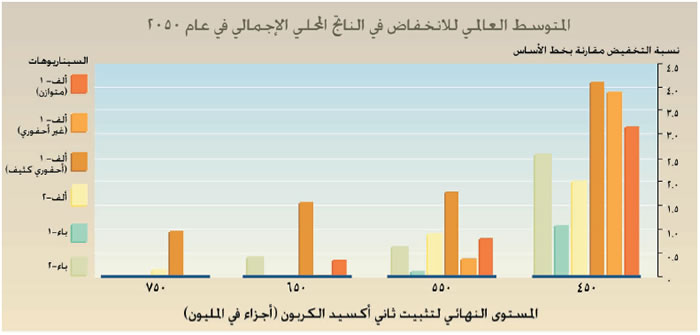 الشكل 9 في الملخص لصانعي السياسات: العلاقة الإرشادية في عام 2050 بين الخفض النسبي للناتج المحلي الإجمالي الناجم عن أنشطة التخفيف وسيناريوهات التقرير الخاص ومستوى التثبيت. وينـزع الخفض في الناتج المحلي الإجمالي إلى التزايد في ظل قوة مستوى التثبيت، ولكن التكاليف تتسم بحساسية شديدة لاختيار سيناريو خط الأساس. ولا تأخذ تكاليف التخفيف المقدرة في الاعتبار الفوائد المحتملة لتغير المناخ المتجنب (لمزيد من المعلومات، يمكن الرجوع إلى التعليق على الشكل 7-4 من التقرير الأساسي).
