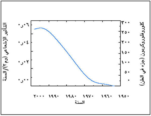 ) في الغلاف الجوي (جزء في الطن) من 1950 إلى 1998 استنادا إلى القياسات المنتظمة ونماذج الانبعاثات ويرد التأثير الاشعاعي للكلوروفلوروكربون في المحور على اليمين [استنادا إلى