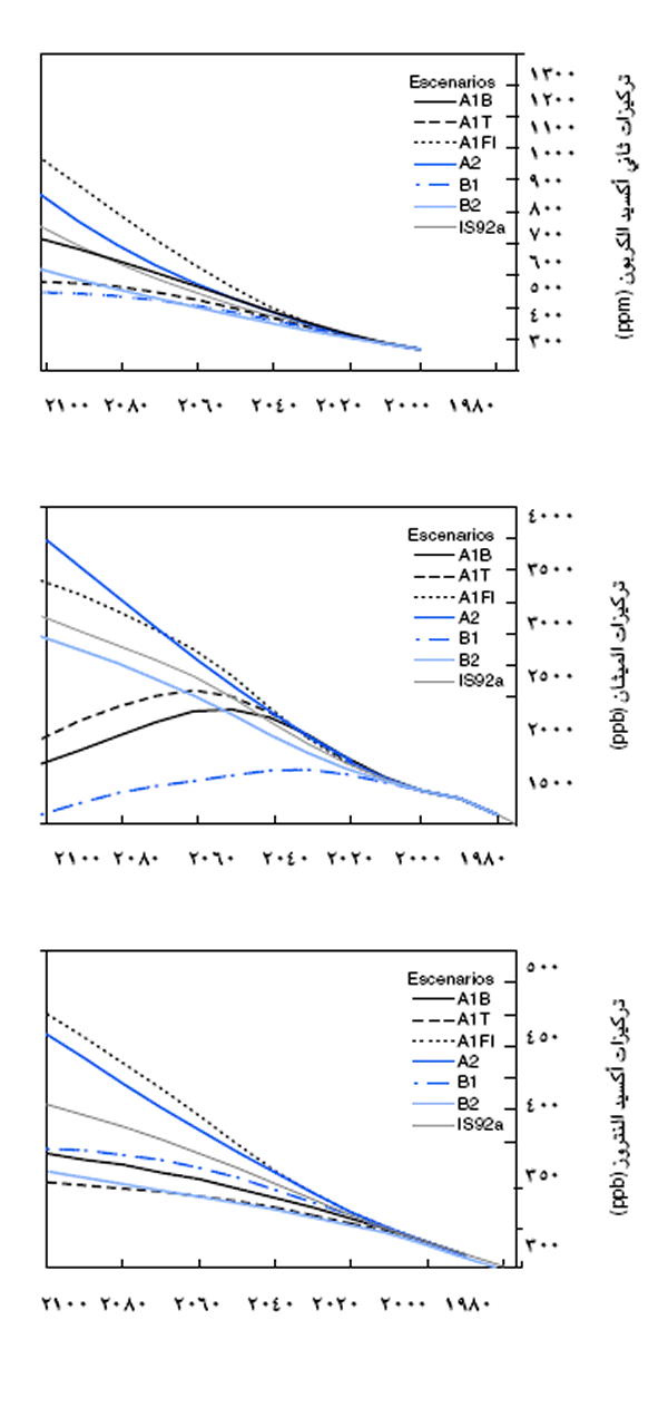 تركيزات ثاني أكسيد الكربون والميثان وأكسيد النتروز في الغلاف الجوي الناشئة عن سيناريوهات التقرير الخاص الست ومن سيناريو 1992 محسوبا على أساس المنهجية الحالية [استنادا إلى
