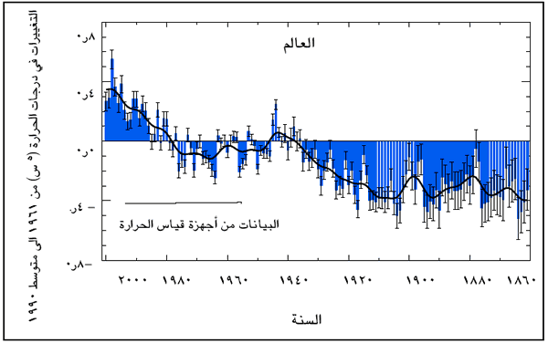 حالات الشذوذ فى درجات الحرارةالسنوية لهواء سطح الأرض وسطح البحر مجتمعة (درجة °س) فى الفترة من 1861 إلى 2000 مقابل 1961 إلى 1990. وعرضت على الأعمدة الخاصة بالعدد السنوي حالات عدم اليقين [حسب