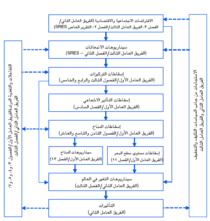 مجموعة عدم اليقين في الاسقاطات التي سيجري دراستها لوضع سيناريوهات خاصة بالمناخ وما يتصل به لتحديد تأثيرات تغير المناخ وتقديرات التكيف معها وتخفيف حدتها. [استنادا إلى