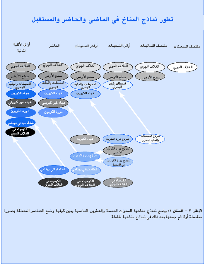 وضع نماذج مناخية للسنوات الخمسة والعشرين الماضية يبين كيفية وضع العناصر المختلفة بصورة منفصلة أولا ثم جمعها بعد ذلك في نماذج مناخية شاملة.