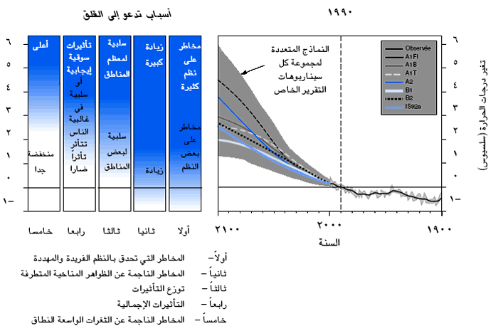 أسباب تدعو إلى القلق فيما يتعلق بمخاطر تغير المناخ الناشئة حتى عام 2100. ويشير