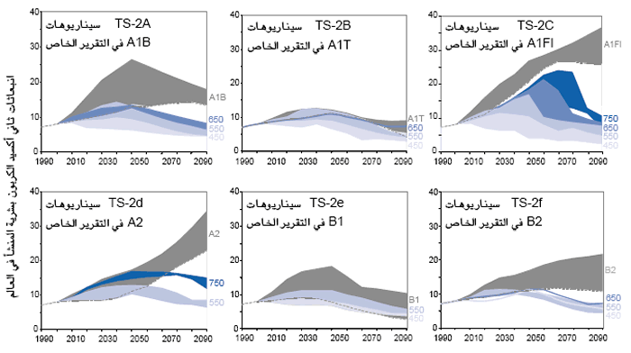وتثبيت تركيزات ثاني أكسيد الكربون عند مستوى 450 و 550 و650 و 750 جزءاً