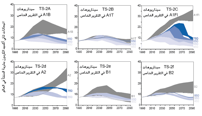 الانبعاثات (SRES). ويبين كل جزء من الشكل نطاق مجموع انبعاثات ثاني أكسيد الكربون