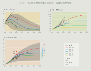 | 减少温室气体排放和减少影响这些温室气体浓度的气体对稳定辐射强迫是必需的。例如,对于最重要的人为温室气体、碳循环模型模拟结果表明,要求在未来几十年、一个世纪或两个世纪内全球人为CO2排放保持低于1990年的排放水平并在以后继续稳定减少,大气中CO2浓度水平才能稳定在450ppm,650ppm,1000ppm(图SPM-6)。模型模拟结果表明对稳定在450ppm的情形下,未来十至二十年温室气体排放将达到峰值(450ppm),而对于稳定1000ppm的情形大约在一个世纪。最终CO2排放量将仅为目前排放量的很小一部分。不同稳定水平的效益将在问题6中讨论,而其成本将在问题7中讨论。 | |||