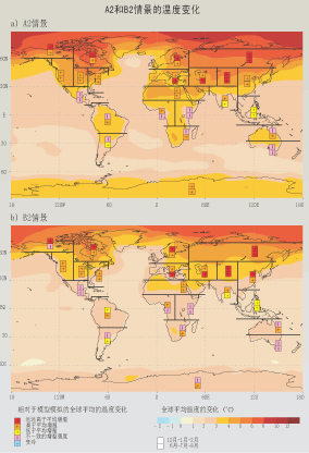 | 3.11 | 几乎所有陆地的升温速度可能都比全球平均要快,特别是在冬季的北部高纬度地区。最显著的升温是北美的北部地区以及亚洲北部和中部,每个模型中都显示这些地区的增暖水平超过了全球平均增暖的40%。相反,在南亚和东南亚的夏季以及南美南部的冬季,其增暖水平低于全球平均值(见图3-2)。 |
