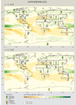 图3-3:图中表明了(a)SRES中的A2情景和(b)SRES中的B2情景的年平均降水量变化(彩色部分)。两个SRES情景应用AOGCM模拟表明了与1961~1990年相比的2071~2100年的变化结果。这里仅表示了A2和B2两种情景,因为其他的情景没有配套的AOGCM模拟模型。方框对模式之间的区域降水变化的一致性进行了分析。区域划分的主要依据为:平均一致增加高于20%(大量增加),平均一致增加高于5~20%(少量增加),变化在-5%~5%或平均变化在-5%~5%之间(没有变化),平均一致下降在-5%~-20%(少量下降),平均一致下降多于-20%(大量减少),或结论不一(无一致迹象)。九个模式中必须至少有七个结论一致才能被作为依据。