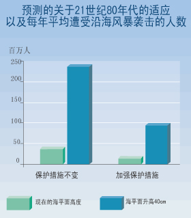 图3-6:预测的关于21世纪80年代的适应以及每年平均遭受沿海风暴袭击的人数。左边两个柱线显示的是,在目前海平面及升高40cm后,在2080年平均遭受沿海风暴的人数,这里有两个假定,即沿海保护设施与现在相比没有变化、人口增长保持适中或中速。右边的两个柱线表示的是同样的结果,但假定沿海设施按照GDP增长的比例增强。 |