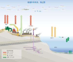 尽管增暖减少了海洋对CO2的吸收,但是预计在大气CO2浓度继续升高的情况下,海洋的净碳吸收至少要持续到二十一世纪。碳从海洋表层到深海的迁移要花费几百年,而与海洋沉积物达到平衡则需要几千年。