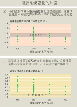 图5-7:全球社会-经济结构驱动稳定CO2浓度价格上扬的惯性,该价格是能源和碳强度变化偏离历史上业已观测到速度的函数。(a),对实现稳定到大约550ppm甚至在450ppm浓度水平以上情形而言,为了实现给定的CO2浓度稳定目标能源强度(能源/GDP)下降所要求的速率是在历史上曾经达到的速率范围内,但(b)为了稳定在600ppm水平以下,碳强度(碳排放/单位能源)改进所要求的速度必须高于历史达到的速度。因此,随着稳定水平的降低,减缓成本会升高,稳定在600ppm的目标就要求比上述更高的成本(图7-3)。 |