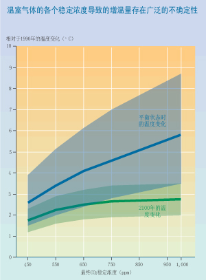 A1B情景,在2100年之后排放水平保持不变,最终大气中CO2的浓度稳定在1000ppm之下的减排措施将使2100年全球平均温度增幅限制在3.5oC之内。大气中CO2的浓度最终稳定在450-1000ppm的情景,预计2100年全球平均地表温度增加1.2-3.5oC。在21世纪,虽然分析的所有CO2浓度稳定情景都可能避免