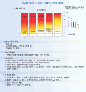 图6-3:稳定CO2浓度可以减轻气候变化危害的风险。图6-3描述了各种全球平均变化强度的不利影响的风险,全球平均温度变化作为气候变化强度的指标。图的右边为2100年不同CO2稳定水平和所有的SRES情景预测的全球平均温度变化。如果将大气中CO2浓度稳定在1000ppm或1000ppm以下,可以避免与2100年温度变化在3.5oC以上的许多风险。稳定的浓度水平更低,风险也将进一步降低。白色表明中性或很小的负面或正面影响或风险,黄色表明一些系统为负面影响或低风险,红色表明更广泛的或强度更大的负面影响或风险。影响或风险的评估仅考虑了变化的强度,而没有考虑变化的速率。全球年平均温度变化作为气候变化强度指标,但影响也是其他一些因子的应变量,如全球或区域平均气候变化强度和速率、气候变率和极端气候现象、社会经济情况和适应能力