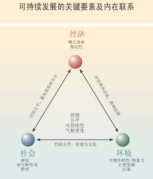 体现了可持续发展的各要素之间的相互联系,展示了一些重要的问题如气候变化、可持续性、贫困、公平性与这三个基本要素有关。正如气候政策能产生改善福利这样的附加效益一样,非气候的社会-经济政策可以带来气候效益。这样的附加效益的利用会促使发展更具可持续性。环境、社会和经济挑战之间存在复杂的相互作用,因此这三种类型问题的任何一种不可能孤立地得到解决。 |