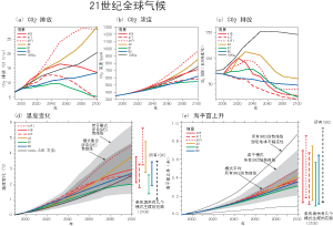 ![]() 图 5: 二十一世纪的全球气候将取决于自然变化和气候系统对人类活动的响应。 气候模式可以预测诸如全球地表温度和海平面上升等许多气候变量对各类温室气体及其它人为排放情景的响应。图(a)表示6个说明性的SRES情景下CO2排放。方框内文字解释了这些情景。同时表示的还有IS92a,以便与SAR比较。图(b)表明所预测的CO2浓度。图(C)给出了人为SO2的排放。其他气体和气溶胶排放也包括在模式里,但图中未表示。图(d)和(e)分别表明了所预测的温度和海平面响应。图(d)和(e)中“若干模式所有SRES包络线”分别表示用简单模式得到的温度和海平面上升值,但此模式已经过调试,使其得到与具备各种气候敏感性的复杂模式相同的输出。所有SRES包络线指35个SRES情景所包括的范围。“模式平均所有SRES包络线”表示在各种排放情景下所有这些模式结果的平均值。注意,从这些排放情景得出的增暖和海平面上升趋势将持续到2100年以后。也注意,这些区间没有考虑与西南极冰盖冰动力过程变化有关的不确定性,同时了没有考虑在预测非硫酸盐气溶胶和温室气体浓度方面的不确定性。[根据(a) 第三章, 图 3.12, (b) 第三章, 图 3.12, (c) 第五章, 图 5.13, (d) 第九章, 图 9.14, (e) 第十一章, 图 11.12, 附录2] |
