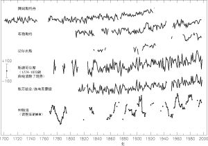 ![]() 图6: 利用北欧、荷兰的阿姆斯特丹、法国的布勒斯特、英国的切尔内斯、瑞典的斯德哥尔摩(在1774-1873年的曲线消除了趋势,以去除冰后期反弹的一级贡献),波兰的斯万欧金(前德国Swinemunde)以及英国的利物浦资料。利物浦资料是“调整过的平均高水”资料而不是平均海平面资料,其中有一段间隔期(18.6年),刻度指示为 ±100 毫米。[根据图11.7] |