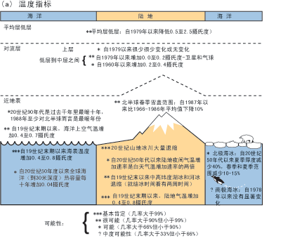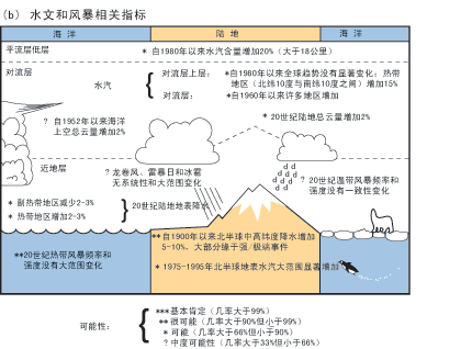 正如上面总结的,气候的全面变化已有很多资料证明,尤其是最近几十年到一百年的时间阶段,此时间段里有不断增加的直接测量。图7展示了温度指标(图7a)和水文及暴雨指数(图7b)的变化趋势,并且提供了关于这些变化确定性的说明。