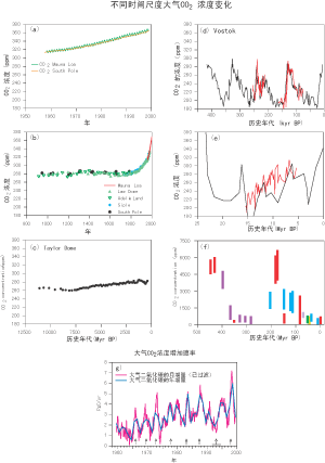 ![]() 图10: 大气CO2浓度在不同时间尺度上的变化。(a)大气CO2浓度的直接观测。(b)过去一千年南极冰芯所得大气CO2浓度,为比较也给出近期的大气观测(Mauna Loa)的结果。(c)Taylor Dome南极冰芯中CO2浓度。(d)Vostok南极冰芯中CO2浓度。(颜色代表不同的研究)。(e-f)根据地球化学循环理论推导的CO2浓度。(彩条和线代表不同的研究)。(g)大气CO2浓度的年增长量。剔除季节循环的大气CO2浓度的月增量。 垂直箭头表示厄尔尼诺事件,水平线表示1991-1994的加强的厄尔尼诺事件。[根据图3.2 和 3.3] |