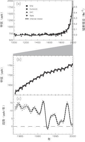 大气甲烷含量持续增加,从1983年的1610ppb到1998年的1745ppb,但观测到的年增加率在这期间却在减少。年增加率在20世纪90年代变化很大,其中,1992年几乎为零,1998年为13ppb。目前对这种变化没有明确的定量解释。自从SAR以来,人们对某些甲烷的人为源,例如水稻田,有了更精确的研究。