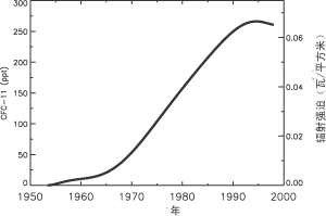 ![]() 图12: 根据平滑后的观测值和排放模式得出的1950-1998年的全球平均CFC-11(CFCl3)的对流层浓度(ppt)。右侧坐标轴表示CFC-11的辐射强迫。[根据图4.6] |