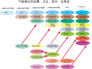 为了对未来气候变化进行定量预测,人们必须用气候模式对控制未来气候变化的所有重要过程进行模拟。随着计算机能力的日益强大,气候模式在过去的几十年里业已发展起来。这期间,气候系统各组成部分的模式,包括大气,陆地,海洋,海冰,均独立发展完成,并逐渐实现耦合。不同组成间的耦合困难重重。最近,硫循环组成部分被耦合进气候模式,它们被用来考虑硫的排放以及气溶胶粒子的氧化形成。目前在少数几个模式中考虑了陆地碳循环和海洋碳循环,而大气化学组成部份则均在气候模式本身之外运行。当然,最终目的是尽可能考虑所有的地球气候系统组成部份及其相互作用,在对未来气候变化的预测中不断考虑到各个组成部份的反馈影响。下图显示出气候模式过去,现在和未来的可能演化。
