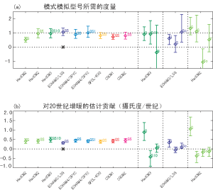 图16: (a)“度量指标估算”,据此将几个模式模拟的信号叠加,以重构观测记录中相应的变化。垂直线段表示由于内在变率而产生的5%-95%的不确定性。一个围绕单位量的范围意味着强迫振幅与模式模拟响应部分叠加,其结果与相应观测变化相一致,而一个包含零的变化范围意味着此模式的模拟信号无法被检测。信号定义为大尺度(>5000公里)范围内1946年到1996年近地面气温(相对于1896年到1996年之间的平均)作为外部强迫的集合平均响应。第一个输入(G)显示了根据观测结果仅包含对温室气体的响应与内在变率假设得到的尺度因子和5%-95%的置信区间。范围明显小于1(与其它模式结果一致),说明仅由温室气体强迫的模式对观测到的变暖信号估算过高。另外的8个输入表示温室气体和硫强迫(GS)下模式模拟的尺度因子,包括间接硫酸盐强迫和对流层臭氧强迫两个过程,臭氧强迫也包括平流层臭氧耗损(分别为GST和GSTO)。除了CGCMI外,这一范围其它模式模拟都与单位量一致。很少有证据显示,在仅仅考虑GS信号和内在变率的假设下,模式会系统性地过高或过低估算观测到的响应幅度(也就是说此种诊断分析中自然强迫净效应很小)。除了ECHAM3(用星号表示)外,其它模式观测的残差变率与这一假设一致。有人想引入假设,使模式仅仅模拟对人类活动的响应,但是由于没有考虑对自然强迫的响应,因此在这些单一信号的模拟中,估算的不确定性是不完全的。然而,正如这些不同模式模拟的一样,高置信度范围表明,近年来近地面温度变化不能解释为气候的内在变率造成的。接下来的三个输入对不确定性进行了更全面的分析,这三个输入分别代表单一的温室气体(G)、硫酸盐气溶胶(S)、太阳因子加火山(N),在只考虑太阳因子(SO)和只考虑火山(V)的情况下也进行了相应信号的模拟。在这些情况下,为了考虑自然强迫响应中的不确定性,同时进行多个因子的模拟。不确定性在增加,但仍能检测到温室气体的响应。只有一种情况(ECHAM3)似乎过高地估算了温室气体的响应(G信号的尺度范围与单位量不一致)。但是这一结论对利用何种成分作为控制量来定义检测空间比较敏感。目前的研究仍不清楚对引入火山信号会如何响应这一问题。在包含太阳因子和火山强迫的情况下(HsdCM2和HadCM3),G和S信号可以被检测出来,与是否联合或单独估算自然信号无关,并且与单位量保持一致(对S、V响应允许存在不同误差)。 (b)基于(a)中的结果,在5%-95%置信区间上,对20世纪全球平均增暖贡献的估算。尽管估算结果变化依赖于所假设的模式信号及强迫,并且估算一个以上的信号会出现高的不确定性,但是所有模式模拟的结果都表明,人类活动对气候变化的影响对20世纪全球变暖具有明显的贡献。[根据图12.12] |