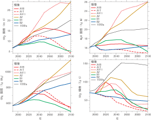 ![]() 图17:6个SRES示例性情景A1B,A2,B1和B2,A1FI和A1T,CO2,CH4,N2O和二氧化硫的人为排放量。为了对比,还给出了IS92a情景的结果。[根据IPCC排放情景特别报告] |
