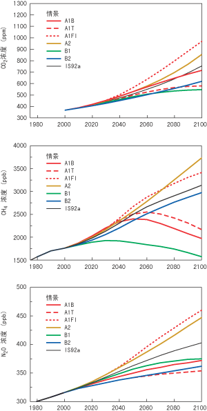 ![]() 图18:对6个SRES情景和IS92a情景,运用目前的方法计算出的大气CO2,CH4和N2O浓度值。[根据图3.12和4.14] |