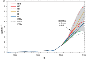 6个示例性SRES排放情景几乎覆盖了整套SRES情景的所有强迫因子范围。图19给出了1765到1990年期间总的历史人为辐射强迫估算量,同时也给出了6个SRES情景的辐射强迫量。图中35个SRES情景的辐射强迫范围用一个阴影区域表示,原因是单个情景的辐射强迫随时间变化会产生交叉。生物质燃烧气溶胶产生的直接强迫以毁林速率表示。SRES排放情景包括了人为气溶胶(例如磷酸盐气溶胶,生物质气溶胶,黑碳和有碳机气溶胶)排放增加或减少这两种可能性,这取决于化石燃料利用程度以及减少污染物排放的政策。这些SRES情景不包括非硫酸盐气溶胶排放量的估算。该报告中提出了两个预测这些气溶胶排放量的方法:第一种方法以CO为参照来估算化石燃料和生物质气溶胶的排放,而第二种方法以SO2的排放和毁林为参照。只有第二种方法用于气候预测。为了对比,也给出了IS92a情景的辐射强迫。很明显,这些新的SRES情景与IS92情景相比,涵盖的范围更大。这主要是因为SRES情景同IS92情景相比降低了未来的SO2排放量,而且一些SRES情景的累积碳排放量也较大。