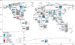 ![]() 图23: 区域性降水变化的模式间一致性分析。图中所示区域划分遵照以下的原则:降水平均增加20%以上(大幅度增加);降水平均增加5%-20%(无变化);降水平均变化-5%--20%(小幅度减少);降水平均减少在20%以上(大幅度减少);或者模式模拟结果不统一(没有一致信号)。一致性定义为9个模式中至少有7个模式的模拟结果一致。[根据第10章,框1,图2] |