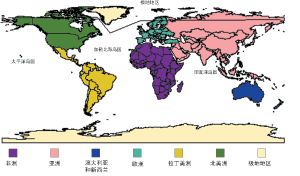 图TS-2:IPCC第二工作组第三次评价的区域:注意小岛国所在的地理位置包括太平洋、印度洋、大西洋、加勒比海和地中海。欧洲和亚洲的边界为从乌拉尔山脉东部、乌拉尔河和里海。对于极地地区,北极地区为北极圈以北的地区,包括格陵兰;南极地区包括南极大陆和-58S以南的海洋。 |