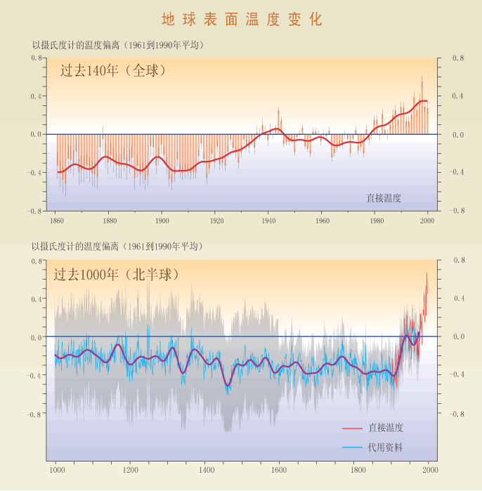 图2-3: 在直接的温度测量时期,地表温度上升了大约0.6o C(1860-2000,上图)。这种增暖是空前的,至少就基于北半球过去1000年的代用温度资料分析来说是如此(下图)。上图中显示了逐年全球平均表面温度距平(红柱,细黑线条表示很可能的波动范围)以及约每十年的全球平均表面温度距平(连续的红线)。分析考虑了资料间断、随机仪器误差和不确定性,以及在海面温度资料误差订正和陆地上城市化影响订正等方面的不确定性。下图合并了北半球的代用资料(逐年为蓝线,很可能的波动范围为灰带,50年平均以紫线表示)和直接温度测量(红线)。代用资料包括树木年轮、珊瑚、冰芯和历史记录,这些资料已经用温度计资料做过校准。要估计南半球这样长的温度变化,资料还不充分。